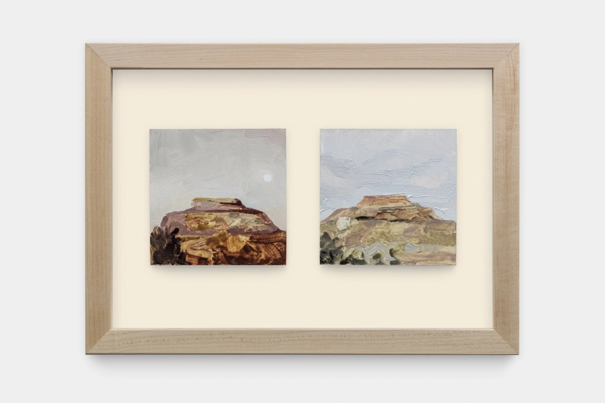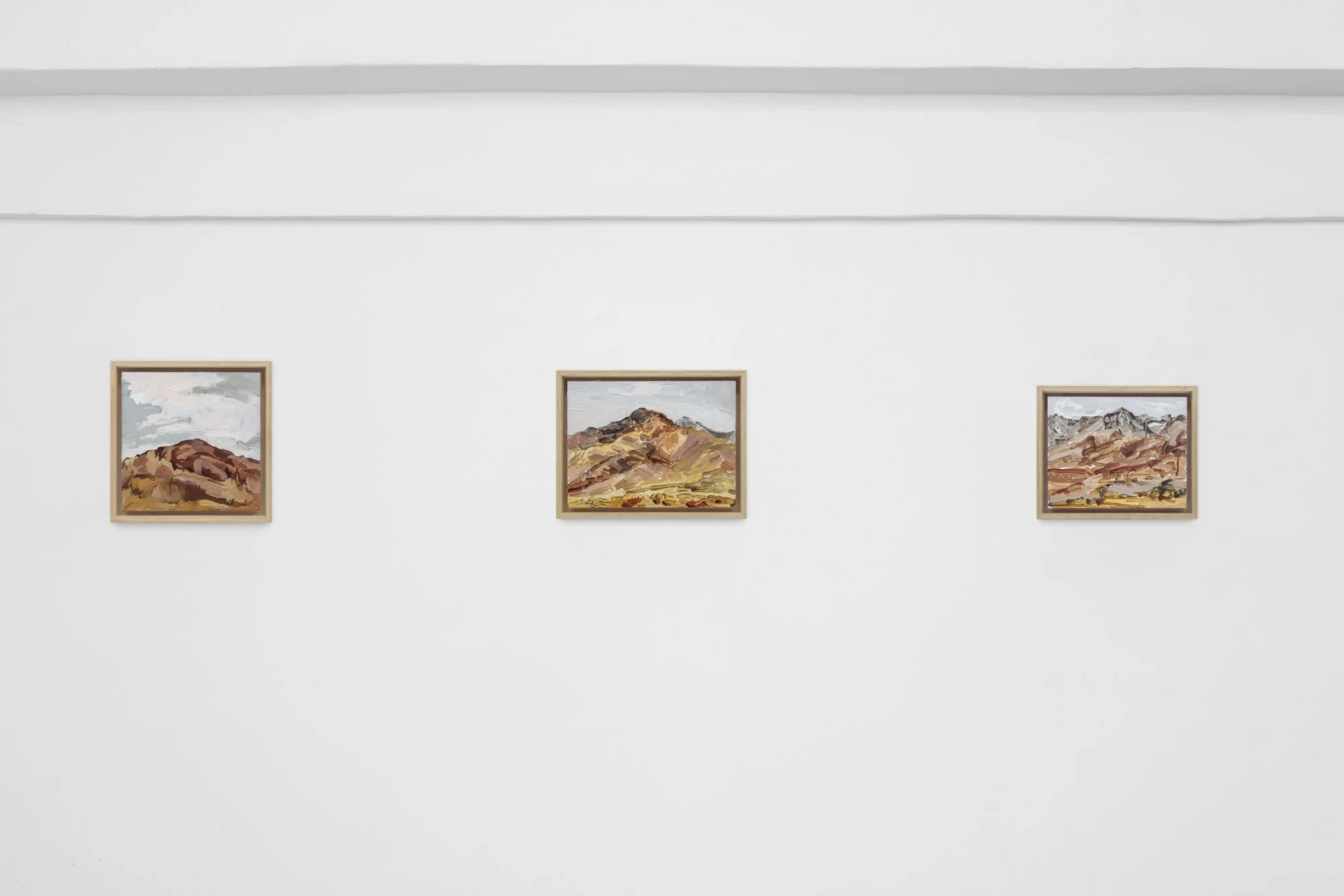 Rachel Rickert's approach to plein-air painting has evolved with her recent move from Brooklyn to Joshua Tree. This transition has transformed her practice into a literal and metaphorical journey. While the works depicting the Joshua Tree landscape are now often painted from the land surrounding her home, the works painted in Wyoming were created on hiking expeditions over the course of a month-long trip. The process of painting plein-air in both locations can be grueling, as it involves enduring harsh weather conditions such as sun, wind, rain, heat, and cold, often within the same day. However, these challenges yield intimate paintings that capture moments of sheer bliss and awe.